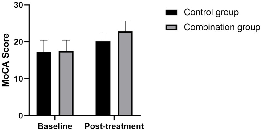 Figure 1. Comparison of MoCA scores between the two groups before and after treatment Compared with the control group, the MoCA scores in the combined group was significantly higher after treatment (p < 0.05).