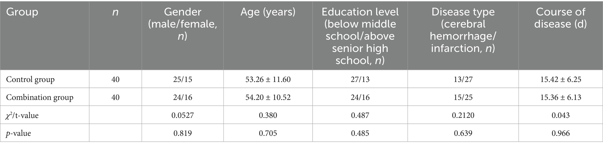 This study was approved by the Medical Ethics Committee of the hospital. A total of 80 patients with mild depression after stroke admitted to our hospital from January 2023 to December 2023 were selected as the subjects. Inclusion criteria: (1) the degree of depression meets the diagnostic criteria for mild depression in ICD (international classification of diseases); (2) the diagnostic criteria for stroke established by the National Academic Conference on Cerebrovascular Diseases are met; 3 No antidepressant treatment was received before enrollment; 4 Hamilton Depression Rating Scale score is greater than or equal to 7 points and less than 17 points. Exclusion criteria: (1) previous history of depression; (2) accompanied by other serious diseases, such as cardiopulmonary dysfunction or tumor history; (3) accompanied by other mental disorder history; 4 Failure to complete the full course of treatment. They were divided into the control group and the combination group according to different intervention regimens, with 40 patients in each group. There was no significant difference in gender, age, education level, disease type and course of disease between the two groups (p > 0.05), but they were comparable (see Table 1). All patients gave informed consent for the study and signed an informed consent form.