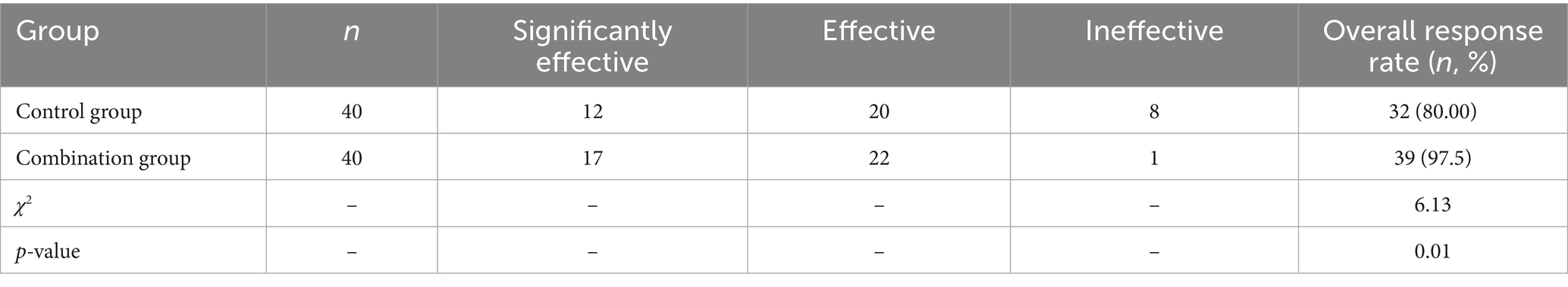 The total effective rate of the combination group was significantly higher than that of the control group (χ2 = 6.13, p < 0.05) (see Table 2).