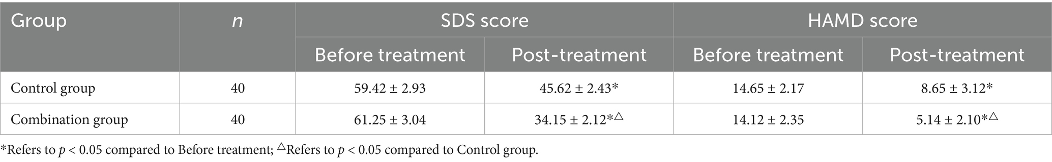 Before treatment, there was no significant difference in depression scores (including HAMD-17 and SDS scores) between the control group and the combination group (all p > 0.05); After treatment, the scores of HAMD and SDS in control group and combination group were significantly lower than those before treatment (all p < 0.05); After treatment, the HAMD-17 and SDS scores of patients in the combination group were significantly lower than those in the control group (all p < 0.05) (see Table 3).