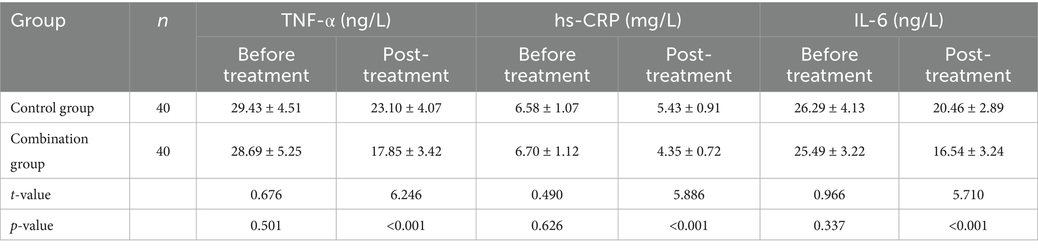 Before treatment, there was no significant difference in the levels of inflammatory factors (including TNF-α, hs-CRP and IL-6) between the control group and the combination group (all p > 0.05); After treatment, the inflammatory factors of control group and combination group decreased significantly compared with those before treatment (all p < 0.05); After treatment, the inflammatory factors of patients in the combination group were significantly lower than those in the control group (all p < 0.05) (see Table 4).