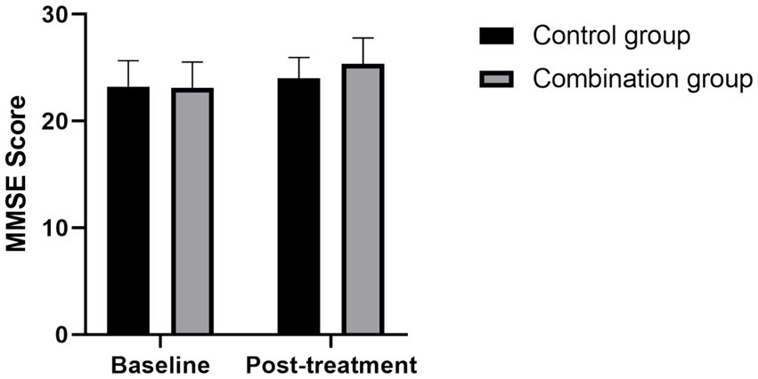 Comparison of MMSE scores between the two groups before and after treatment Compared with the control group, the MMSE scores in the combined group was significantly higher after treatment (p < 0.05).