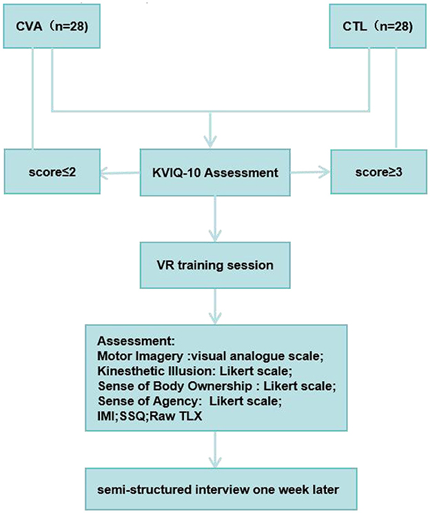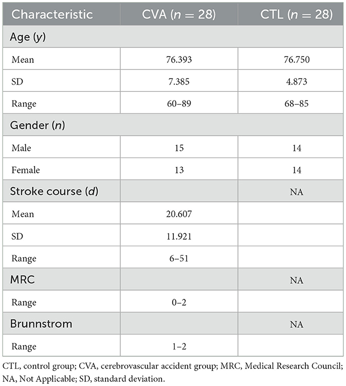 Totally 28 stroke cases (cerebrovascular accident [CVA] group) and 28 gender- and age-matched healthy individuals (control [CTL] group) assessed by physiotherapists and occupational therapists based on the Kinesthetic and Visual Imagery Questionnaire (KVIQ-10) (37) were included (Table 1). The study had approval from the Biomedical Ethics Committee of Beihang University (number BM20230165), and each participant provided signed informed consent.