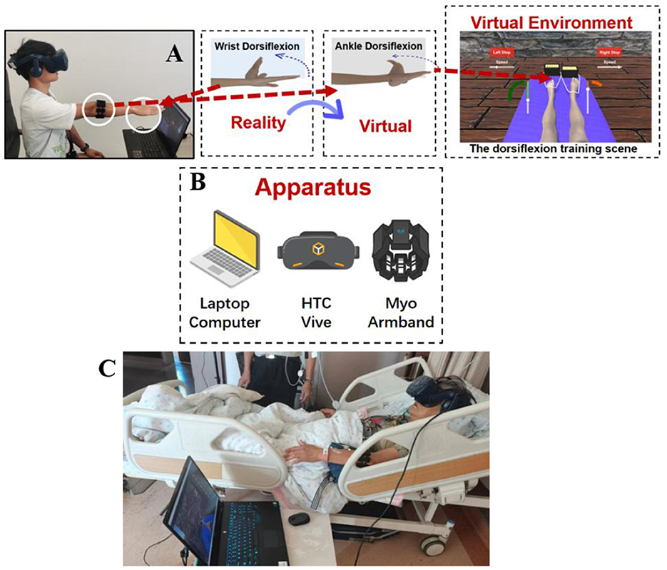 Figure 2. Schematic diagram of the virtual reality rehabilitation training system and its clinical application scenario. (A) Schematic diagram of the overall experimental system structure; (B) Schematic diagram of the system hardware setup; (C) Illustration of patient operation during actual VR training session: A patient with right-sided hemiplegia wore a HMD and a Myo armband on the left forearm. By using the sEMG signal from the left wrist movement, the patient controlled the virtual ankle on their right side.