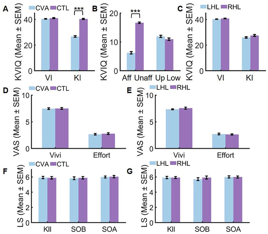 Figure 3. Performance before (A–C) and after VR training (D–G). Aff, affected side; CTL, control group; CVA, cerebrovascular accident group; Effort, imagery effort; KI, Kinesthetic Imagery; KIl, Kinesthetic Illusion; LHL, left hemispheric lesions; Low, lower limb; RHL, right hemispheric lesions; SEM, standard error of mean; SOA, Sense of Agency and Motor Control; SOB, Sense of Body Ownership; Unaff, unaffected side; Up, upper limb; VI, visual Imagery; Vivi, imagery vividness (***Padj < 0.001).
