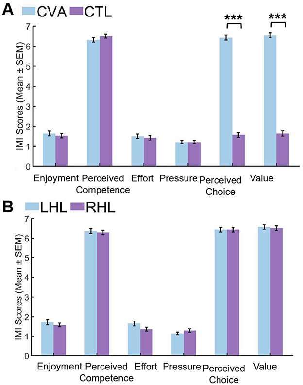 Figure 4. Comparison of IMI scores between groups. (A) CVA group vs. CTL group. (B) LHL group vs. RHL group. CTL, control group; CVA, cerebrovascular accident group; LHL, left hemispheric lesions; RHL, right hemispheric lesions; SEM, standard error of mean (***Padj < 0.001).