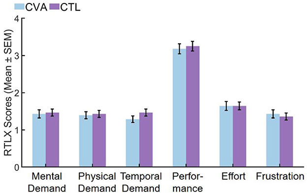 Figure 5. Comparison of RTLX subscales scores in the CVA and CTL groups. CTL, control group; CVA, cerebrovascular accident group; SEM, standard error of the mean.