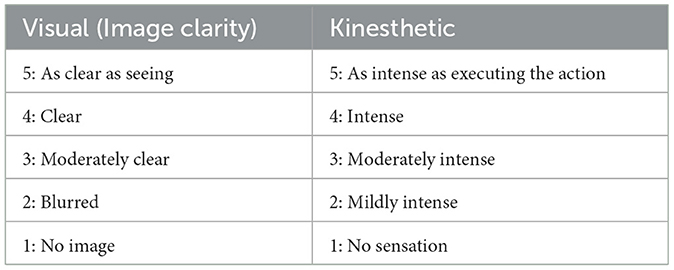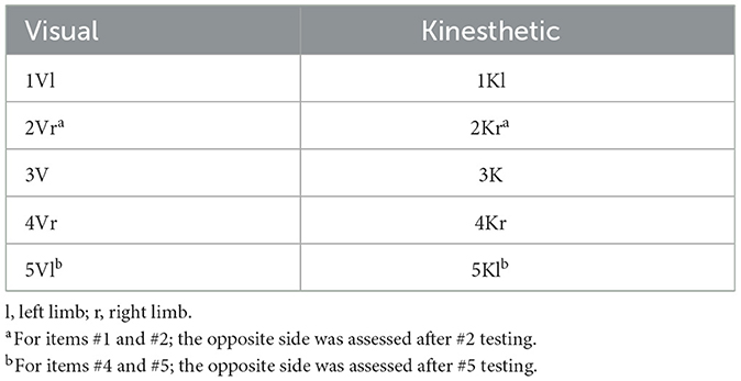 The KVIQ-10 questionnaire assesses both visual (V) and kinesthetic (K) subscales of motor imagery. It includes 5 movements per subscale (totally ten items) reflecting gestures with various body parts, i.e., forward shoulder flexion, thumb finger opposition, forward trunk flexion, hip abduction and foot tapping. The test was performed with the patient sitting on a chair with a backrest and the examiner sitting in front of them. Each item was assessed as follows: (1) the patient assumed the starting position per the examiner's demonstration; (2) the examiner for demonstration performed the movement, which was executed by the subject physically once (in case of inability to execute the movement physically with the affected limb, the unaffected limb was employed); (3) the patient was requested to resume the starting position and to imagine carrying out the movement they just executed; (4) the examiner asked the patient to rate the visual image for clarity or the intensity of the sensations associated with the imagined movement on a 5-point scale (Table 2). The patients rated the imagery with operational definitions for various categories (e.g., 5, image as clear as seeing) and the resulting numbers were further analyzed. For items that involve limb movement, both sides were assessed: for items #1 and #2, the opposite side was assessed following item #2 testing; for #4 and #5, the opposite side was assessed after item #5 testing (Table 3). Visual imagery was examined first, followed by kinesthetic imagery (Tables 2, 3).