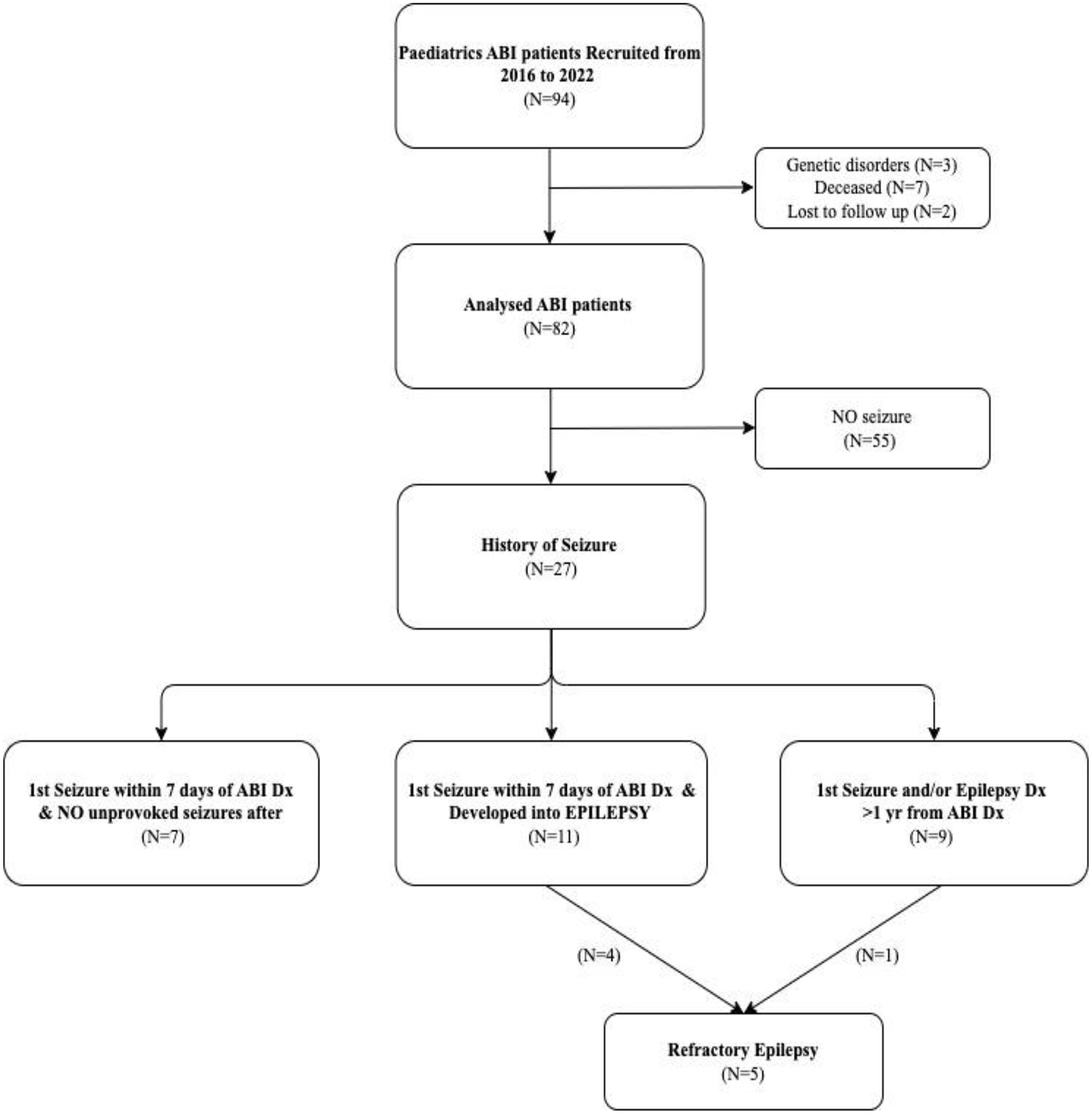 Age at diagnosis, gender, etiology of ABI, Glasgow coma scale (GCS) at presentation, location, and severity of brain injury on first brain imaging, treatment modalities, use of prophylactic anti-epileptic drugs (AED) post-ABI, seizure characteristics, time to epilepsy onset from ABI diagnosis, first and latest scores on the Lansky play-performance scales (LPPS) or Karnofsky performance scales (KPS), the latest documented developmental quotient (DQ) or intelligent quotient (IQ), hearing impairment, vision impairment, motor deficits, psychiatric diagnosis, and special educational needs (SEN) were collected over a follow-up period of at least 2 years from diagnosis. For patients with seizures, use of prophylactic AEDs, timing of first seizure, seizure type, electroencephalography (EEG) findings, time to onset of epilepsy post-ABI, history of status epilepticus, epilepsy types, current AEDs, and epilepsy control were extracted.