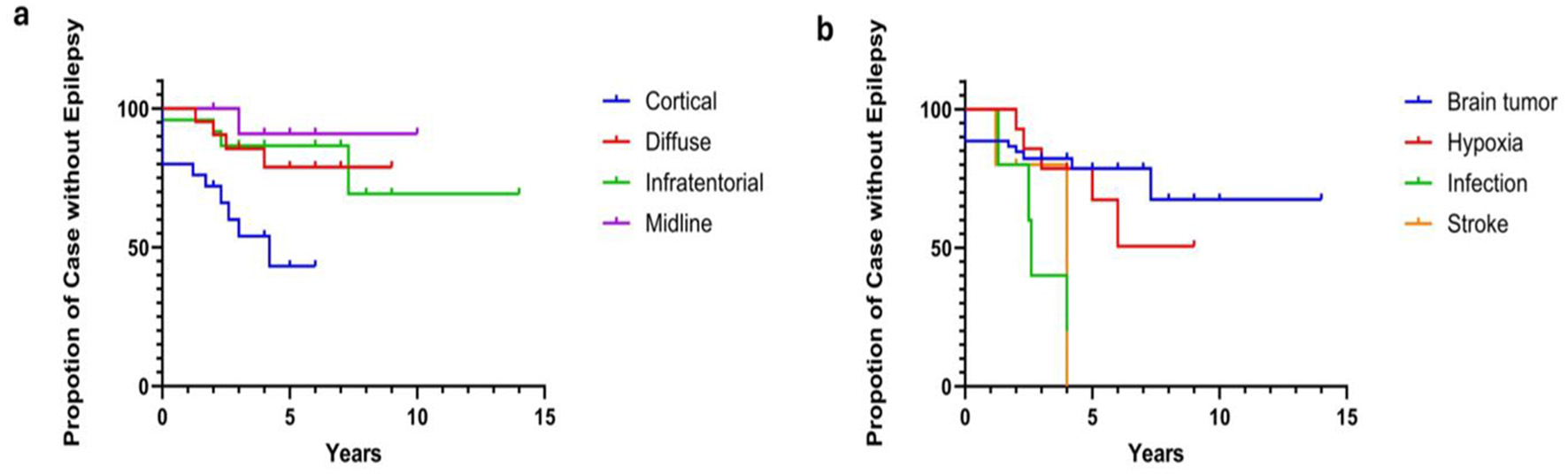 The study included 82 children with ABI due to tumors, trauma, hypoxia, stroke, infection, and neuro-inflammatory disorders. There were 43 (52%) boys. The median age at diagnosis was 2.9 years and median follow-up interval was 5 years. A total of 27 (33%) children experienced seizures and 20 (24%) were diagnosed as having epilepsy. Risk factors for seizures included cortical brain injury (p = 0.013) and central nervous system (CNS) infection (p = 0.001). Among those with seizures, seven had acute seizures within 7 days of ABI. The median time of onset of epilepsy after ABI was 2 years, and five children had refractory epilepsy (RE) needing more than two anti-epileptics. The hazard ratio (HR) for epilepsy in those with cortical brain injuries and CNS infections were 4.582 (95% CI [1.83, 11.49], p = 0.001) and 4.796 (95% CI [1.568, 14.67], p = 0.006), respectively. HR for epilepsy onset in those who had post-stroke seizures were 4.467, 95% CI [1.575, 12.67], p =0.005). Most subjects demonstrated significant improvements in Karnofsky Performance Scale (KPS) scores following rehabilitation (p < 0.0001); however, a greater proportion of children with post-ABI seizures required special educational services (p = 0.025).