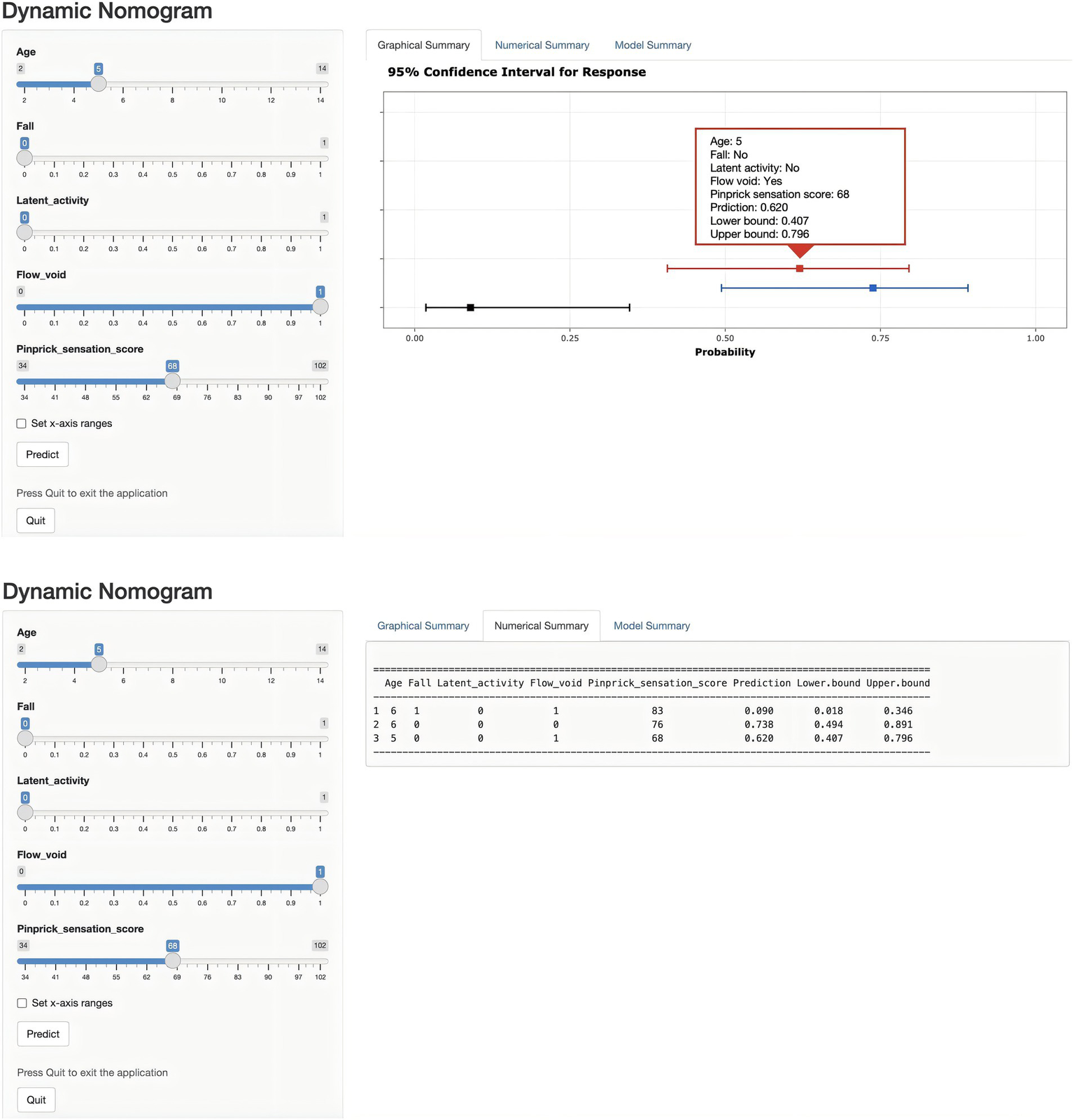 Univariate and multivariate logistic regression analyses were performed on the predictors identified by LASSO regression, as shown in Table 2. In the end, five statistically significant variables—age, fall, latent activity, flow voids, and pinprick sensation—were incorporated into the final predictive model, which was subsequently visualized as a nomogram (Figure 4). To overcome the limitations of traditional nomograms with higher-order interactions, we developed a Shiny-based dynamic nomogram (Figure 5) (25). It predicts the risk of ATM in children with PAHSCI with 95% confidence intervals, displaying results both graphically and numerically, and is freely available at https://leihonghui.shinyapps.io/DynNomapp/.