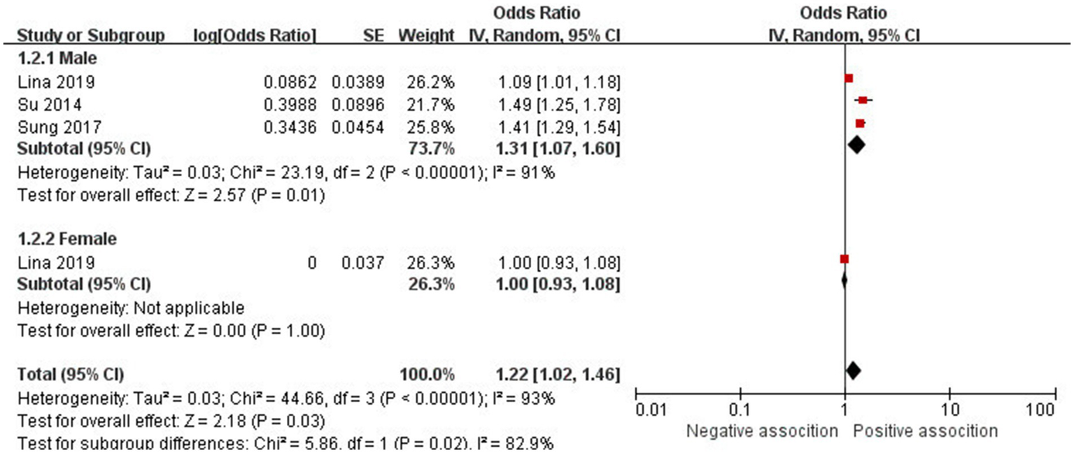 | Male | 3 | 1.31 (1.07–1.60) | p = 0.01 | 91% | P < 0.00001 |