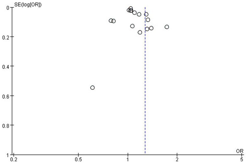 According to the funnel plot, our team did not identify any significant publication bias (Figure 8). Additionally, we employed a one-by-one exclusion method to verify the stability of our research findings. After excluding each study individually, we observed that the results remained largely unchanged, indicating that the meta-analysis results exhibit strong stability (see Supplementary Table S5).