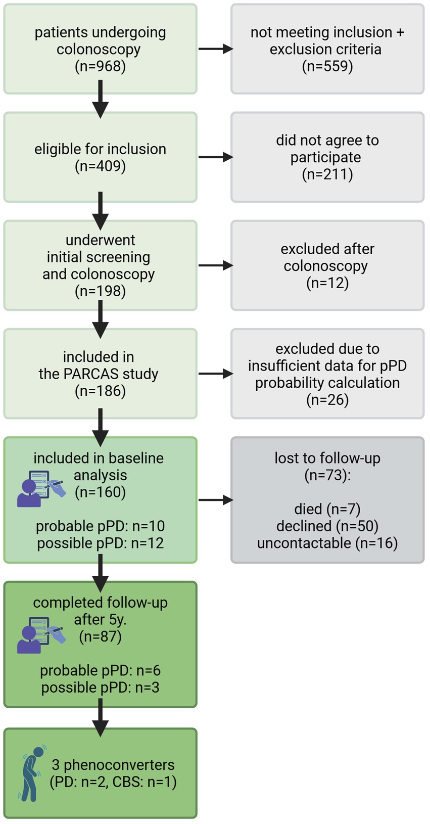 Flowchart illustrating the PARCAS study participant selection process. Out of 968 patients undergoing colonoscopy, 409 were eligible. After exclusions and refusals, 198 underwent screening. 186 were included in the PARCAS study, leading to 160 in baseline analysis. Follow-up after five years included 87 participants, identifying three phenoconverters (two PD, one CBS).
