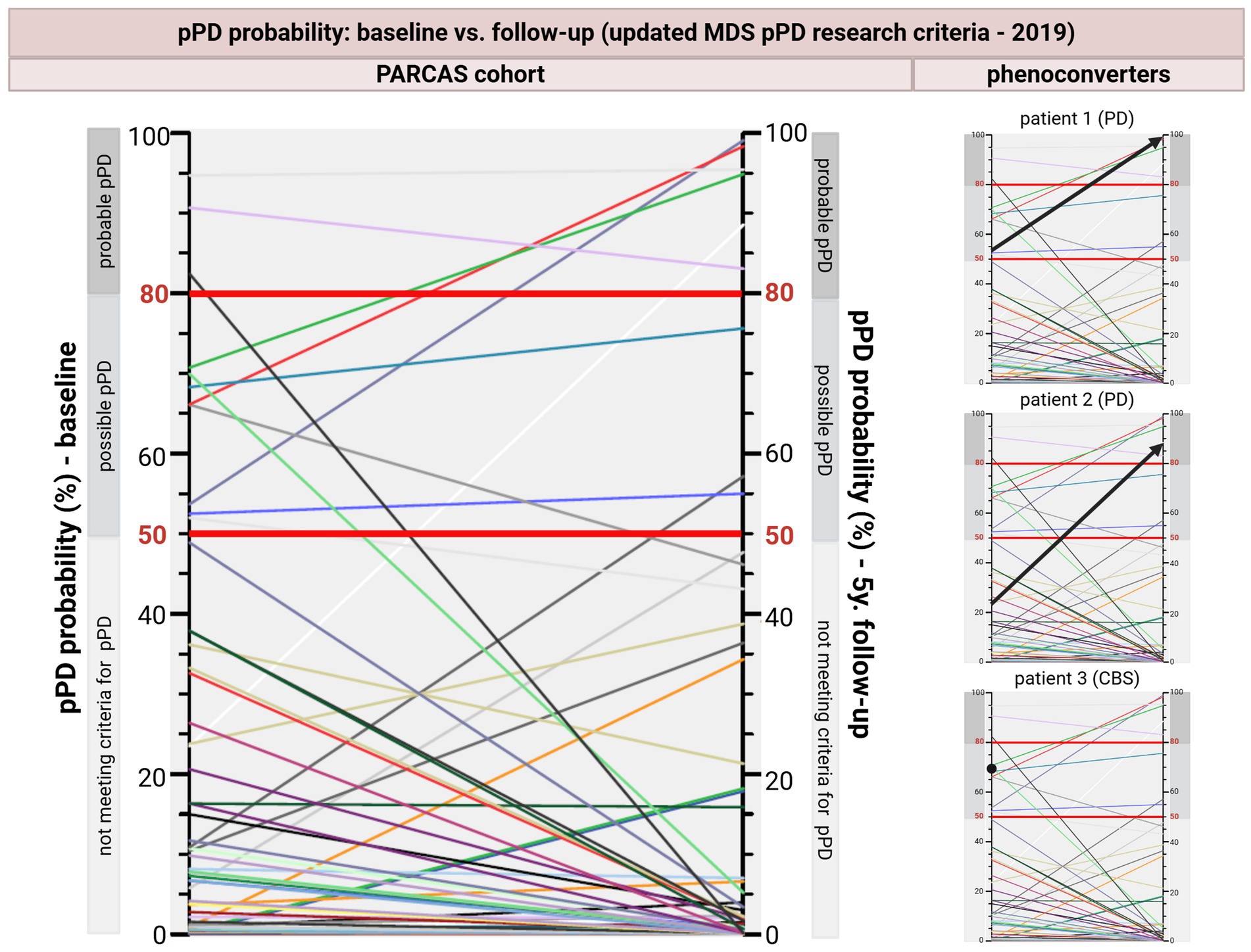 Figure 2. Evolution of prodromal Parkinson’s disease probability scores as defined by the updated MDS pPD research criteria—from baseline to follow-up after 5 years. Left side: summary graph for the entire PARCAS cohort; right side: individual phenoconverted patients highlighted; red lines—50 and 80% probability cut-offs for possible and probable pPD, respectively; individual narrow color lines representing individual participants and their % pPD probability change from baseline to follow-up; individual bold black arrows/dot representing phenoconvertes. CBS: corticobasal syndrome; pPD: prodromal Parkinson’s disease; y: years.