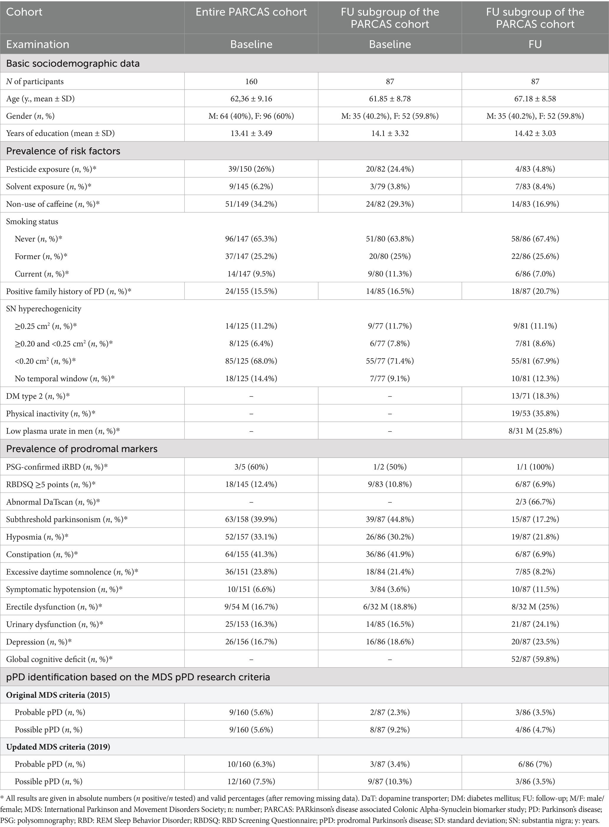 Table 1. Characteristics of the PARCAS cohort at baseline and follow-up and prevalence of risk factors and prodromal markers based on the MDS pPD research criteria.