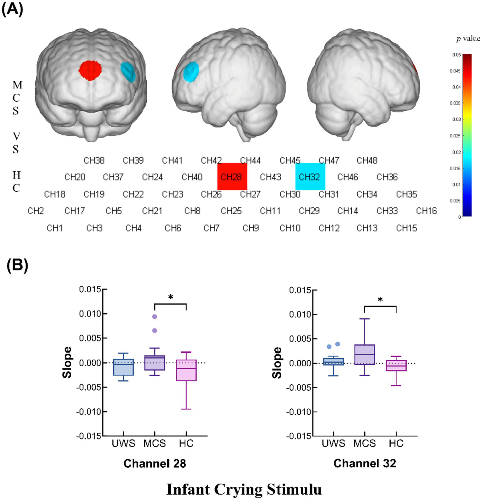 Our findings show that compared with HCs, MCS patients elicited greater changes in slope values at channels 28 and 32, which represent frontal regions associated with emotion regulation and decision-making, suggesting that infant crying sounds can have a strong emotional and attentional impact on adults. The higher slope values in the MCS group than in the HC group could reflect heightened sensitivity to emotionally charged, biologically relevant stimuli, a pattern that has been observed in other studies exploring emotional and auditory processing (52, 53).