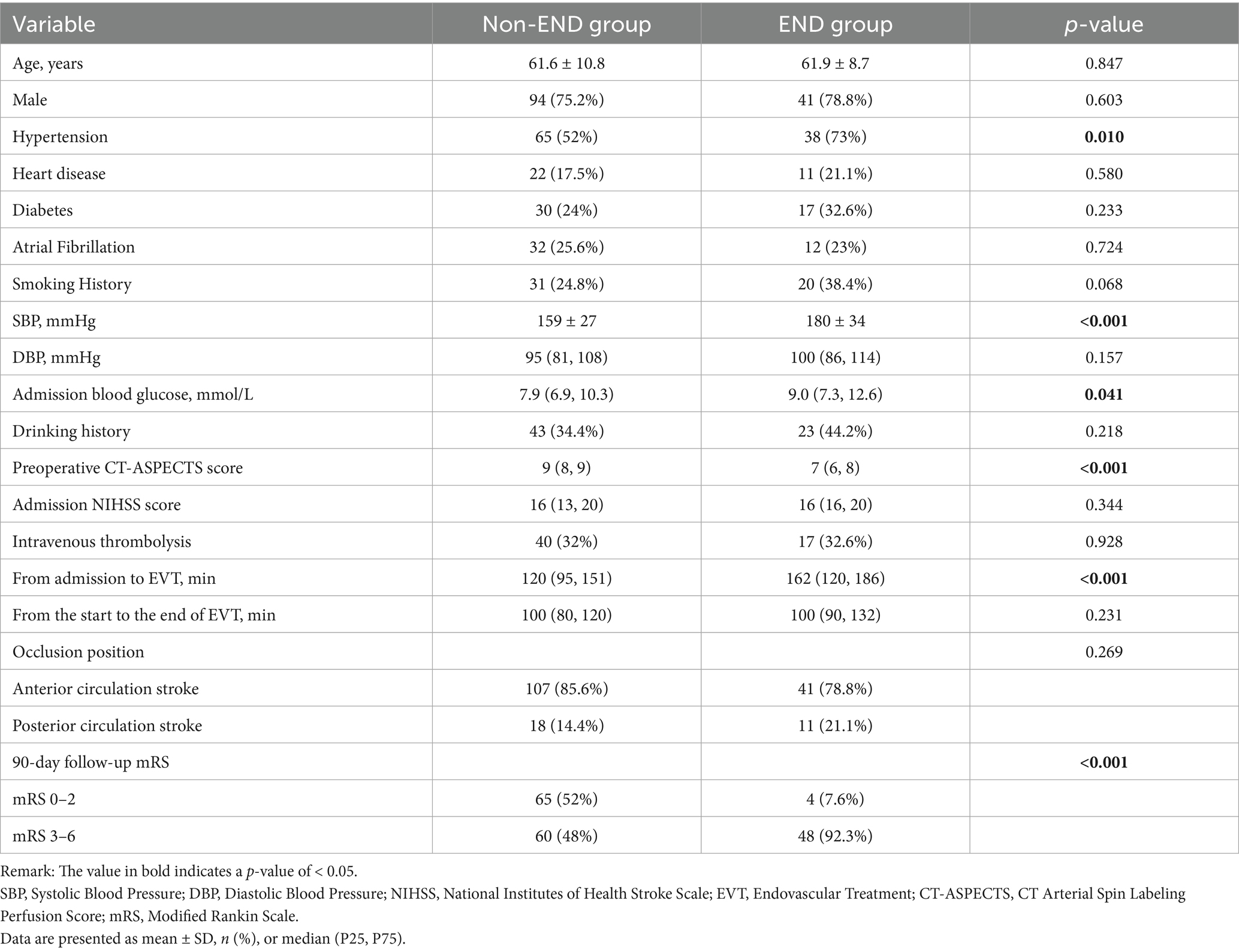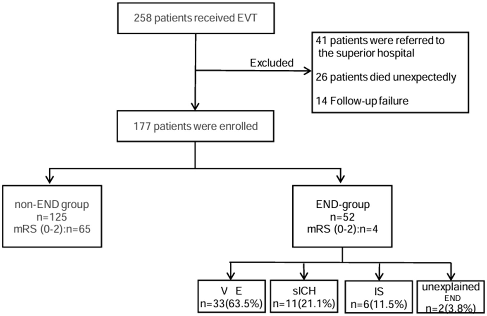 A total of 258 patients received EVT, and a total of 177 patients were ultimately included in our analysis. END occurred in 52 cases (29.4%). These included 33 (63.5%) cases of VE, 11 (21.1%) cases of sICH, six (11.5%) cases of IS, and two (3.8%) cases of unexplained END (Figure 1). In total, four patients (7.6%) in the END group achieved functional independence (mRS 0–2), and 65 patients (52%) in the non-END group achieved functional independence (mRS 0–2) (Figure 2).
