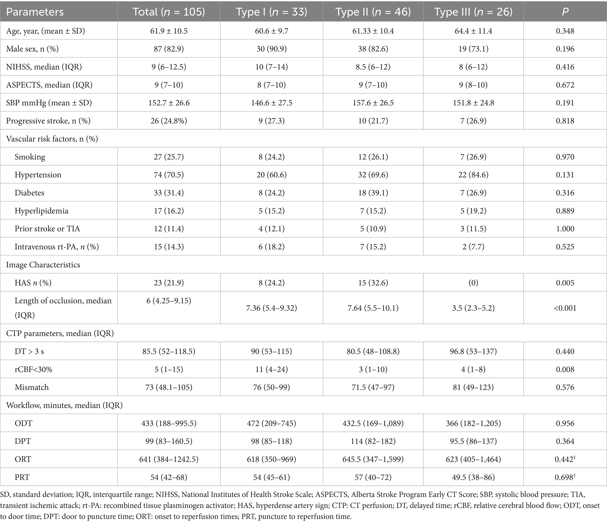 The baseline characteristics are presented in Table 1. The TS-type I group exhibited a larger baseline infarct core volume (11 mL vs. 3 mL vs. 4 mL, p = 0.008) compared to the other two groups. The TS-type III group had a shorter occlusion length (7.4 mm vs. 7.7 mm vs. 3.5 mm, p < 0.001) and a lower prevalence of HAS (24.2% vs. 32.6% vs. 0%, p = 0.015) than the other subtypes.