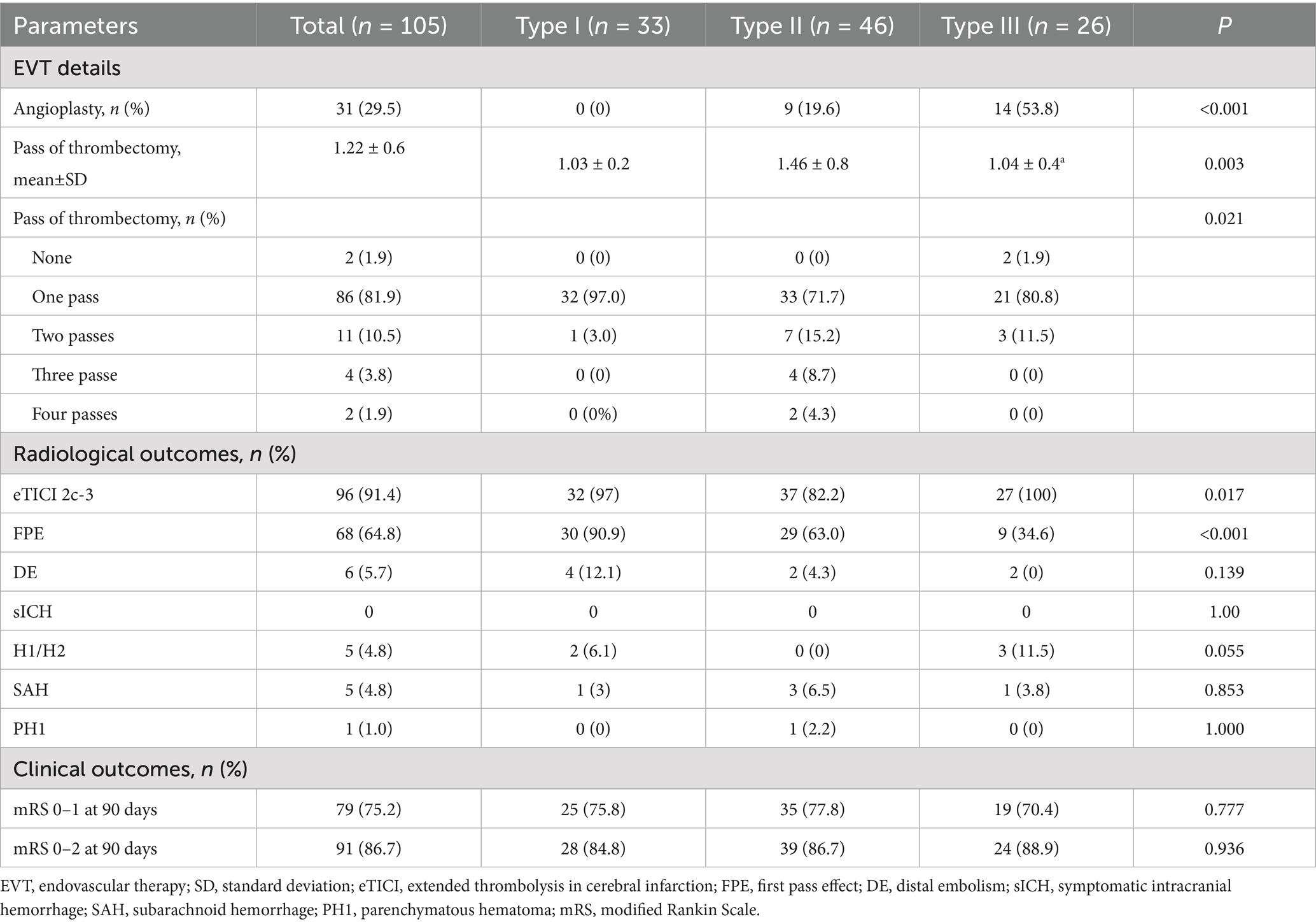 Patients were categorized into three groups based on the TS classification criteria by four independent readers. In cases of disagreement, the relevant cases were re-examined, and any disputes were resolved through consensus. The interobserver reliability was assessed using the kappa (k) coefficient, with k values ranging from 0.70 to 0.89 indicating good consistency, and values between 0.9 and 1 representing excellent consistency. Quantitative variables were presented as the mean and standard deviation (SD) or the median and interquartile range, while categorical variables were expressed as the number of cases (N) and frequencies (%). For continuous variables with a normal distribution, Student’s t-test was conducted, whereas the Mann–Whitney U-test was utilized for continuous variables without a normal distribution or ordinal variables. Analysis of variance (ANOVA) was performed for comparisons among the three groups, followed by Bonferroni correction for pairwise comparisons. The chi-square (χ2) test was applied to categorical variables. Variables with a p < 0.05 were incorporated into the multivariable regression model to ascertain the correction between TS Subtype with EVT strategy and clinical Outcome, with odds ratios (ORs) being calculated. All statistical analyses were executed using SPSS 20.0 (IBM, Armonk, New York, USA) and R statistical software (Version 4.1.3), and a p < 0.05 was deemed statistically significant.