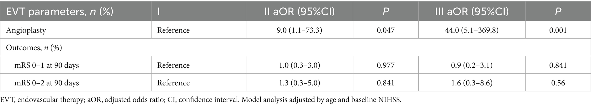 In TS-type I cases, approximately 94% of patients achieved successful reperfusion after thrombectomy using a stent retriever or aspiration, suggesting that direct clot retrieval may be an optimal strategy for TS-type I. In contrast, more than 60% of patients with TS-type III underwent emergent angioplasty to achieve successful reperfusion, and no thrombus was observed in any TS-type III cases, indicating that direct emergent angioplasty may be more suitable for TS-type III. The treatment dilemma for TS - type II was the high degree of lesion stenosis, which may restrict the retrieval of clots located distal to the stenotic site. Consequently, TS-type II patients required a higher number of stent retriever passes and had a lower rate of complete reperfusion. In this regard, the BASIS technique, recently proposed by our team, can successfully address the technical difficulties associated with TS-type II (27). All practical EVT strategies in our study aligned with the assumptive EVT strategy for each respective TS subtype. Moreover, higher rates of favorable functional outcomes, absence of sICH and re-occlusion in our study supported the correctness of the strategies we made based on the TS classification. Therefore, thrombectomy randomized controlled trials (RCTs) based on the TS classification are warranted for acute ICAD-related occlusion.