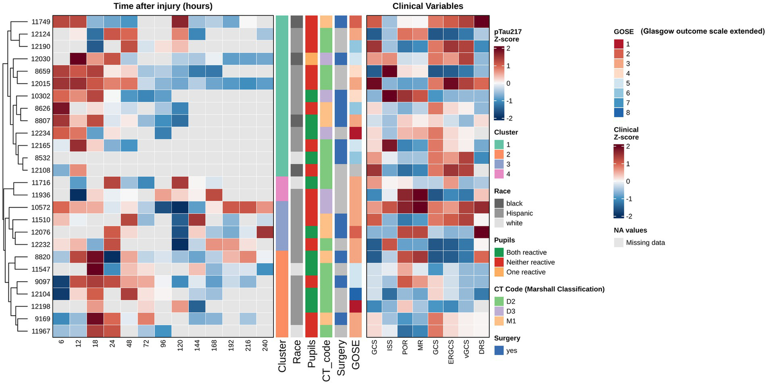 To further investigate inter-patient variability in pTau-217 trajectories, we performed unsupervised hierarchical clustering of the 26 TBI patients based on their serial CSF pTau-217 profiles (6 h through 240 h). This analysis revealed four distinct clusters of patients with qualitatively different pTau-217 temporal patterns (Figure 5). Patients in Cluster 2 had consistently high and sustained pTau-217 levels across the acute phase; notably, this cluster’s average Z-score remained elevated at most time points. In contrast, patients in the other clusters (Clusters 1, 3, and 4) exhibited lower pTau-217 trajectories, with some displaying early peaks followed by rapid declines (e.g., Cluster 3), while others showed more moderate or fluctuating levels. Notably, these clusters appeared to correspond with specific clinical features: patients in Cluster 2 (high-pTau group) predominantly had diffuse axonal injury on their initial CT scans (Marshall classification grade D3) and tended to have worse 6-month outcomes. When we examined the CT findings and outcomes, patients with diffuse injury (D3) had significantly higher mean pTau-217 levels than those with focal contusions or mass lesions (Marshall grade M1) (two-tailed t-test, p = 0.023), aligning with the idea that more diffuse brain injury releases more tau. Additionally, CSF pTau-217 levels at 24–48 h showed an inverse correlation with GOSE score (Spearman ρ = −0.67, p < 0.01), indicating that patients with higher pTau-217 acutely often had poorer neurological outcomes at 6 months. These exploratory findings, visualized in Figure 5, suggest that a subset of severe TBI patients (Cluster 2) may experience an exceptionally robust and prolonged elevation of tau, potentially reflecting a greater axonal injury burden. In contrast, other patients exhibit a more transient or minimal release of tau. We stress that this clustering result is hypothesis-generating; nevertheless, it provides insight into the heterogeneity of TBI pathophysiology and raises the possibility that early pTau-217 trajectory patterns could be associated with injury type and prognosis.