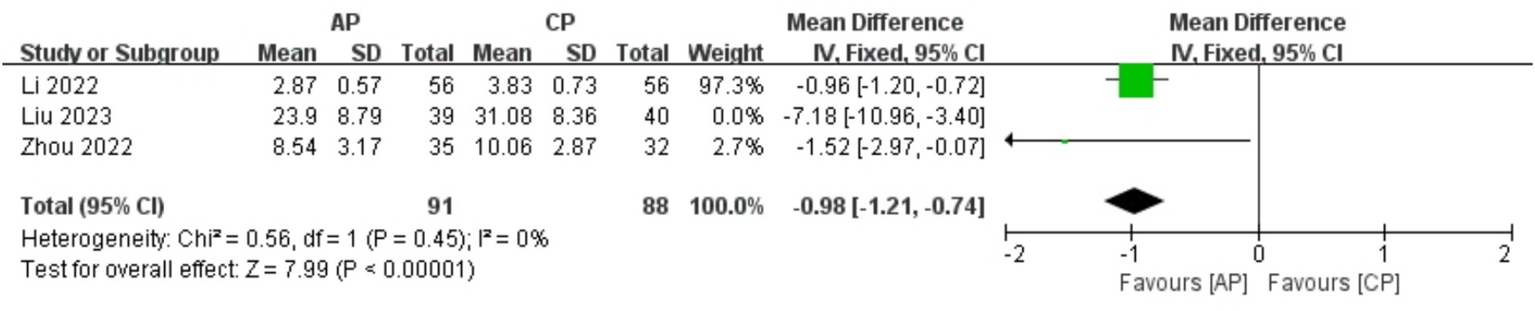 A total of 258 patients in 3 studies (21, 23, 28) reported the TCMS scores of AP in PMI. Analysis of the extracted data indicated high heterogeneity (p = 0.004 < 0.1; I2 = 82%), so a random-effects model was applied [MD = −2.22, 95% CI (−4.19, −0.26), Z = 2.22, p = 0.03 < 0.05]. Using a stepwise exclusion method, it was found that when the study Liu et al. (21) was excluded, the heterogeneity significantly decreased (p = 0.45 > 0.1; I2 = 0%), suggesting that this study might be the source of the heterogeneity. Consequently, a fixed-effects model was applied. Compared with control group, AP showed a statistically significant improvement in TCMS scores among perimenopausal women [MD = −0.98, 95% CI (−1.21, −0.74), Z = 7.99, p < 0.00001], as detailed in Table 7 and Figure 6.