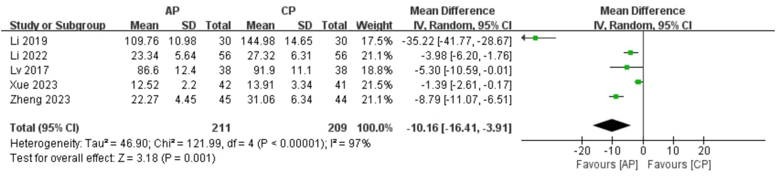 The strengths of the study are reflected in the following aspects: (1) The study involved a comprehensive search across 8 databases, ensuring a wide scope and thorough content coverage; (2) The analysis included 8 commonly used clinical outcome indicators, making the results more accurate and credible; (3) During the literature inclusion process, strict criteria were applied to select the interventions (with experimental group receiving AP and control group only receiving the corresponding Western medication), which helped to avoid excessive heterogeneity to some extent; (4) The article evaluates the efficacy of AP in PMI, and the analysis results demonstrate that the combination therapy is more advantageous than Western medication alone in treating PMI, highlighting the innovation and unique advantages of TCM combined with pharmacotherapy.