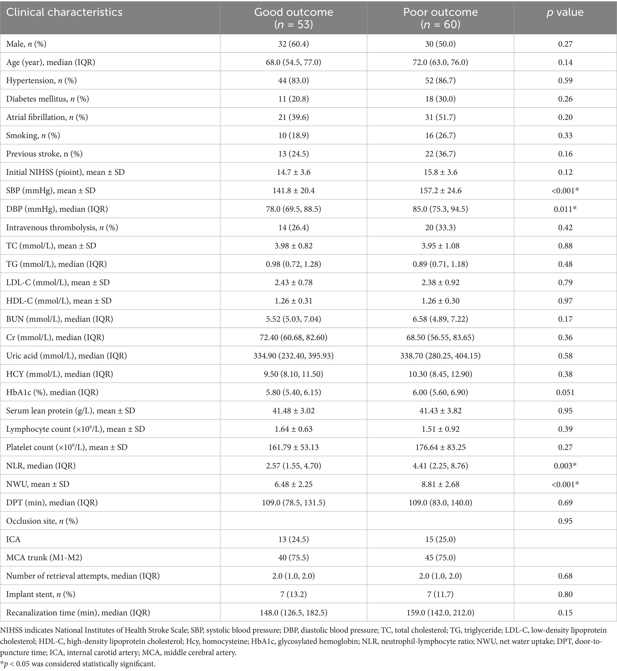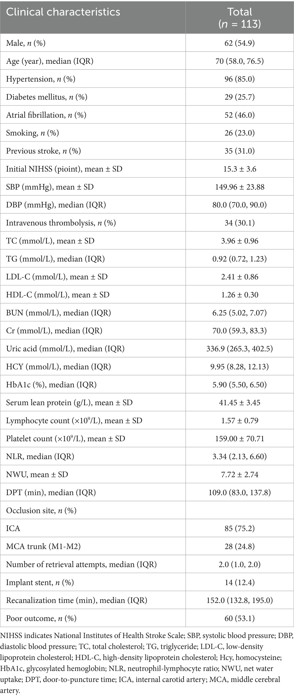 The mean NIHSS score on admission was 15.3 ± 3.6 points. Intravenous thrombolysis was administered to 34 (30.1%) patients. The internal carotid artery of 85 (75.2%) patients and the M1-M2 segments of the middle cerebral artery of 28 (24.8%) patients were occlusive. Based on preoperative cranial CT imaging, the mean NWU was 7.72 ± 2.74%. The median door-to-puncture time DPT was 109.0 (83.0–137.8) minutes, with a median of 2.0 (1.0–2.0) retrieval attempts. Emergency stenting was performed in 14 (12.4%) patients. The median recanalization time was 152.0 (132.8–195.0) minutes. Among the 113 participants, 60 (53.1%) had poor 90-day clinical outcomes, and 8 (7.1%) died (Table 1).