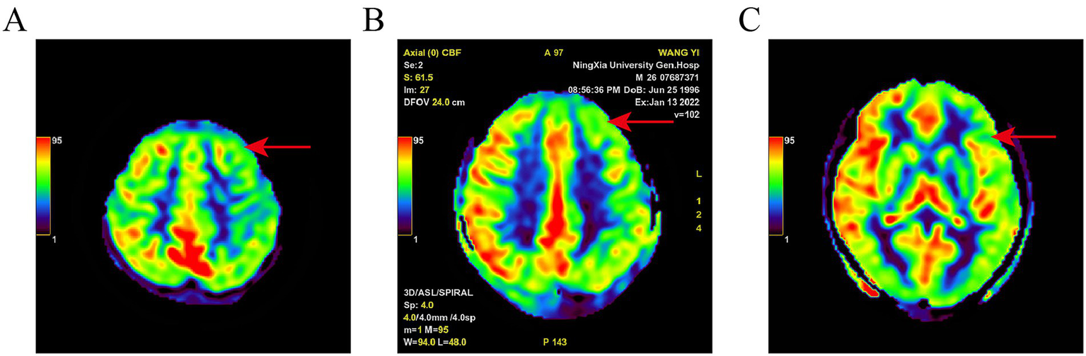 Figure 2. Pseudo-color map of ASL in a PWE. Different color bands and values in the upper left corner represent CBF from low to high; (A): left frontal lobe hypoperfusion; (B): left frontal lobe hypoperfusion; (C): left temporal lobe hypoperfusion. Red arrow indicates ischemic lesion.