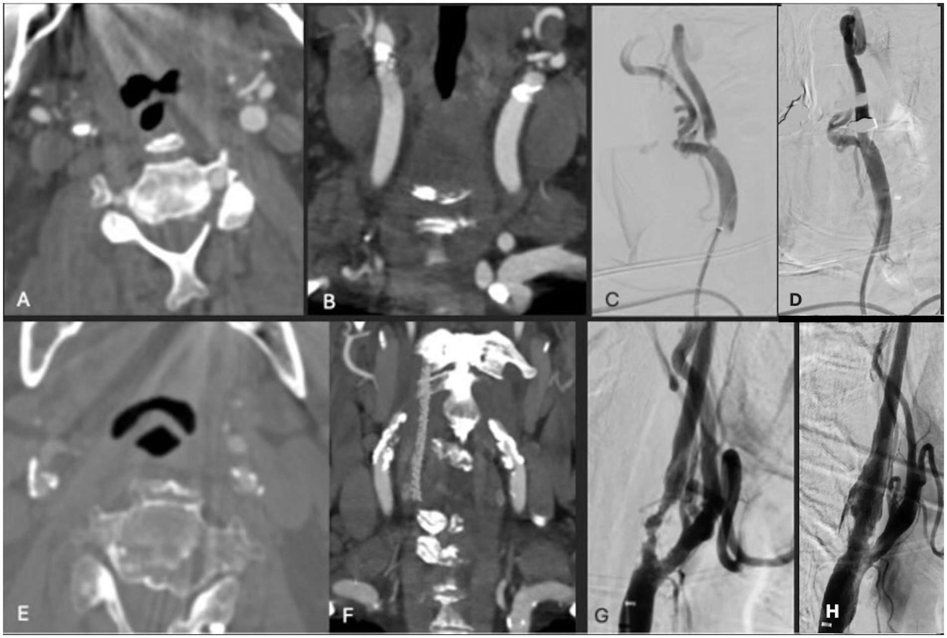 Figure 1. (A,B) Axial and coronal CTA demonstrating right ICA circumferential calcified stenosis. Catheter angiography demonstrating (C) severe R ICA stenosis with (D) significant improvement in caliber and flow within right ICA following lithotripsy, stent and angioplasty. (E,F) Axial and coronal CTA demonstrating right ICA circumferential calcified stenosis. Catheter angiography demonstrating (G) severe R ICA stenosis with (H) significant improvement in caliber and flow within right ICA following lithotripsy, stent and angioplasty.