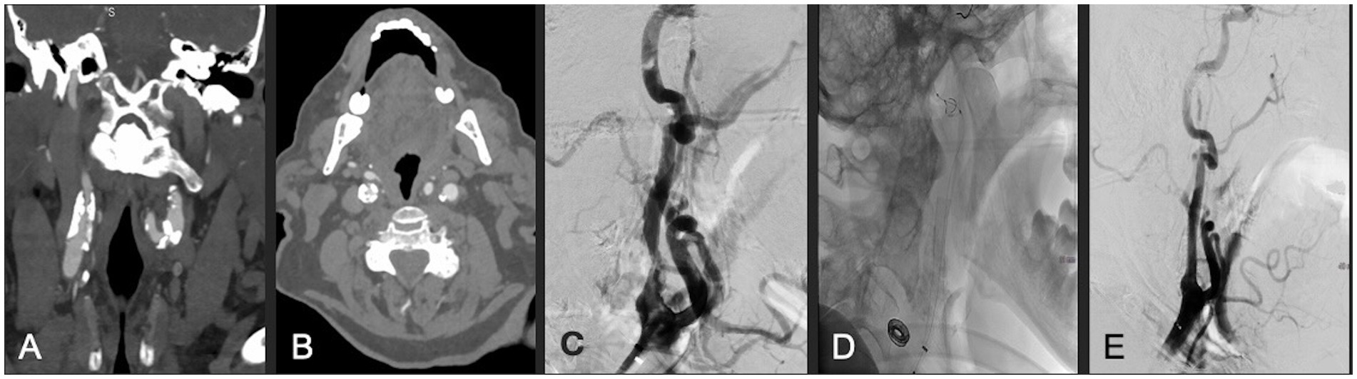 Figure 2. (A,B) Coronal and axial CTA demonstrating right ICA circumferential calcified stenosis. Catheter angiography demonstrating (C) severe ICA stenosis, (D) carotid stent and distal embolic protection device in place, and (E) significantly improved caliber and flow within right ICA following lithotripsy, stent and angioplasty.