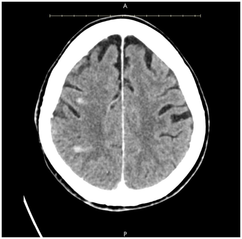 Figure 3. Axial post-contrast CT demonstrating small areas of enhancement within the right MCA territory.