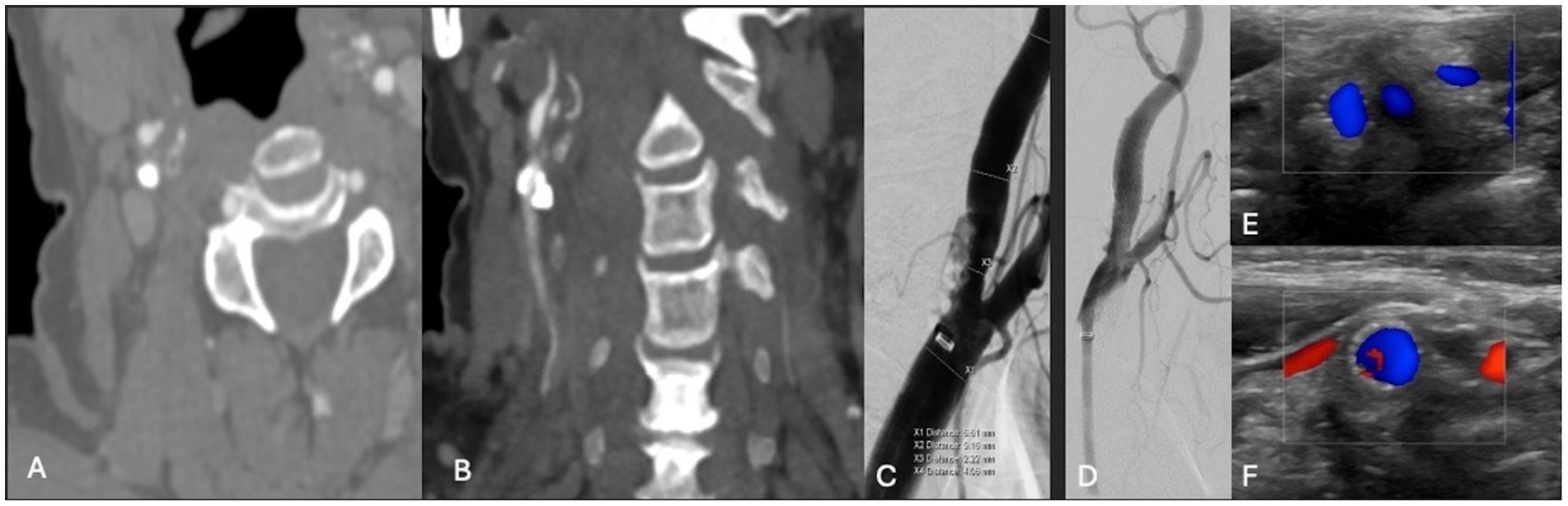 Figure 4. (A,B) Axial and coronal CTA demonstrating right ICA circumferential calcified stenosis. Catheter angiography demonstrating (C) severe R ICA stenosis. (D) Catheter angiography demonstrating improved caliber and flow following lithotripsy, stenting and angioplasty. (E,F) Duplex ultrasonography of the right carotid bulb and ICA following lithotripsy, stent and angioplasty demonstrating stent patency and normal peak systolic velocity.