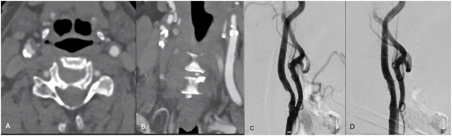 Figure 5. (A,B) Axial and coronal CTA demonstrating right ICA circumferential calcified stenosis. Catheter angiography demonstrating (C) R ICA stenosis with (D) significant improvement in caliber and flow within right ICA following lithotripsy, stent and angioplasty.