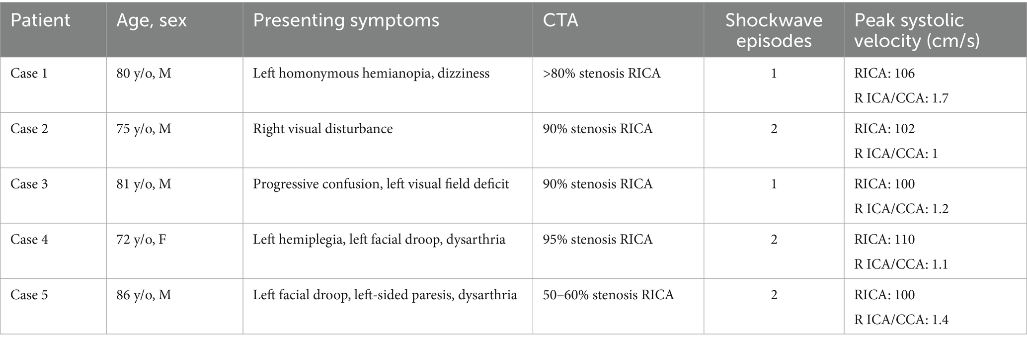 A patient in their 80s presented with left homonymous hemianopia and dizziness (Table 1). CTA revealed greater than 80% stenosis of the right ICA. Associated right hemispheric watershed punctate infarcts were noted on diffusion-weighted MRI. The level of the carotid bifurcation with severely calcified stenosis was located high in the neck and deemed surgically accessible; therefore, CAS with concomitant IVL was recommended over CEA. One episode of sonic pulses was released over 1 min, with approximately one sonic pulse cycle per second (Figure 1). The patient was neurologically intact following the procedure. Post-angiogram ultrasound showed a peak systolic velocity (PSV) of 106 cm/s in the ICA/stent with no significant stenosis visualized within the stent. The PSV ICA/CCA ratio was 1.7 with a normal vertebral artery waveform. Following the stenting procedure, the patient experienced transient hypotension followed by left-sided drift. MRI was completed at that time, showing small foci of acute infarctions in the right frontal lobe and right corona radiata. It was found that the P2Y12 reactive unit assay suggested they were non-responders, and therefore, clopidogrel was stopped and ticagrelor was initiated. The patient was discharged to inpatient rehabilitation after an 8-day hospital stay. At the 3-week follow-up, they had no visual deficit, and the left-sided weakness had resolved. The patient was then transferred to an outside hospital for further care.