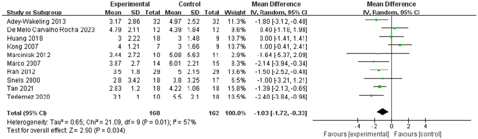 ![Forest plot displaying the mean differences between experimental and control groups across ten studies. Mean differences with 95% confidence intervals are shown as green squares. The overall effect is indicated by a diamond, with a total mean difference of -1.03 [-1.72, -0.33]. Heterogeneity stats are also provided (Tau² = 0.65; Chi² = 21.09; P = 0.01; I² = 57%).](https://www.frontiersin.org/files/Articles/1634623/xml-images/fneur-16-1634623-g002.webp)