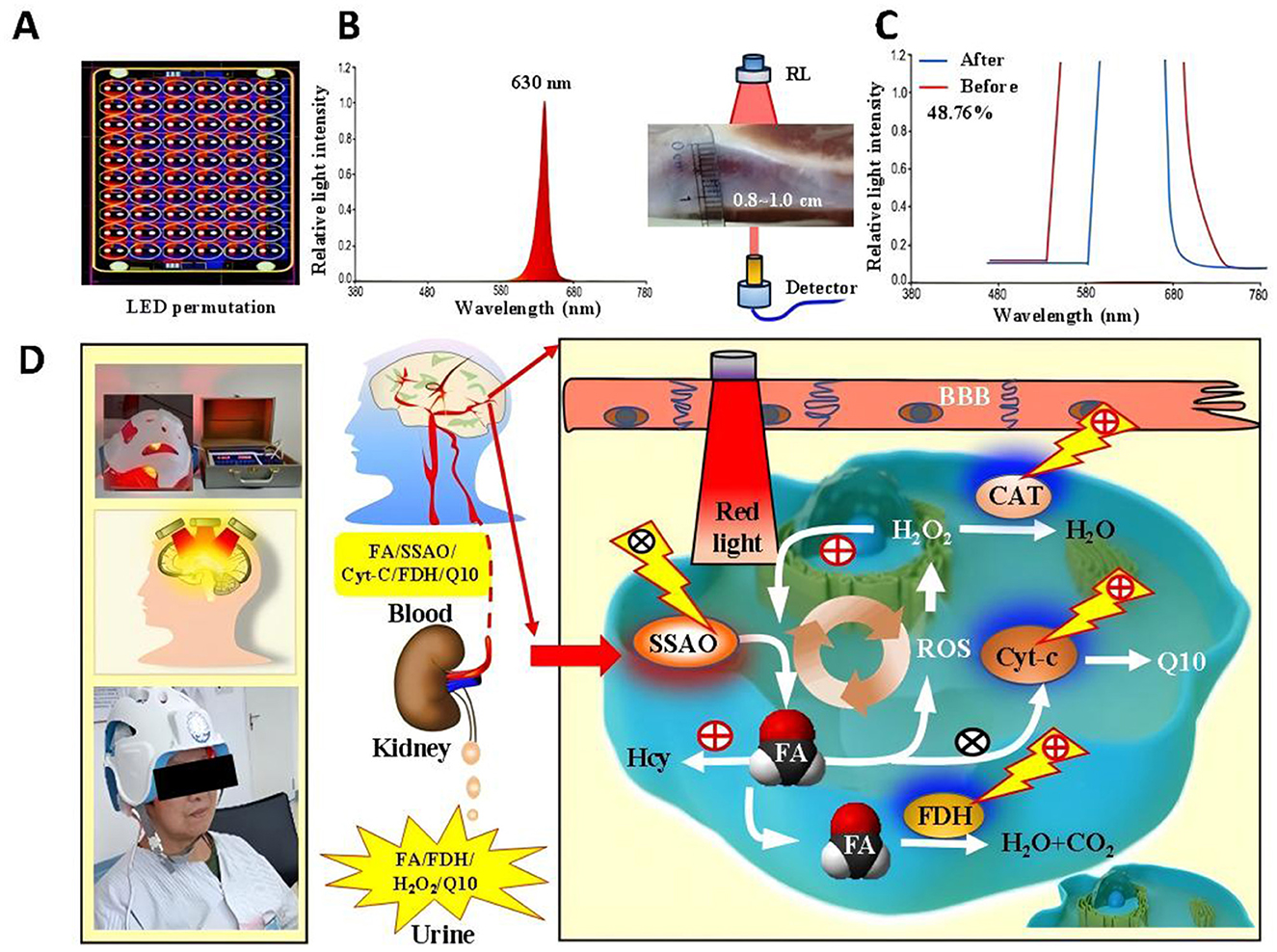 The High-Energy Red Light Device, invented by Professor Tong Zhiqian from our research group (China Invention Patent: ZL2015103542675), and the novel wearable optoelectronic integrated brain rehabilitation device (China Utility Device Quality Supervision and Inspection Center of the National Medical Products Administration and meets the standards of YY 0505-2012 Medical Electrical Equipment—General Requirements for Safety: Electromagnetic Compatibility and YY 0607-2007 Medical Electrical Equipment—Particular Requirements for the Safety of Nerve and Muscle Stimulators (Figures 1A–D). The new device emitted 630-nm red light from LEDs, which was able to penetrate a skull 0.8–1.0 cm in thickness with an estimated penetration rate of approximately 48% (24) (Figures 1A–C). Then, we examined the changes of FA-related metabolism including: semicarbazide-sensitive amine oxidase (SSAO), FDH, Cyt-c, FA, H2O2, and CoQ10 in the blood and urine in the PSCI patients with or without RL therapy (Figure 1D). Model Patent: CN 209865048U were used in this study. The device was manufactured by the Beijing Institute of Major Brain Diseases and ZPARK Zhongguancun High-Tech Enterprise, model JGHNY-Q. It has been tested by the Beijing Medical Participant recruitment, assessment, intervention, and follow-up were conducted in the Third Hospital of Wenzhou Medical University. The case report forms were filled out and kept in the Third Affiliated Hospital of Wenzhou Medical University.
