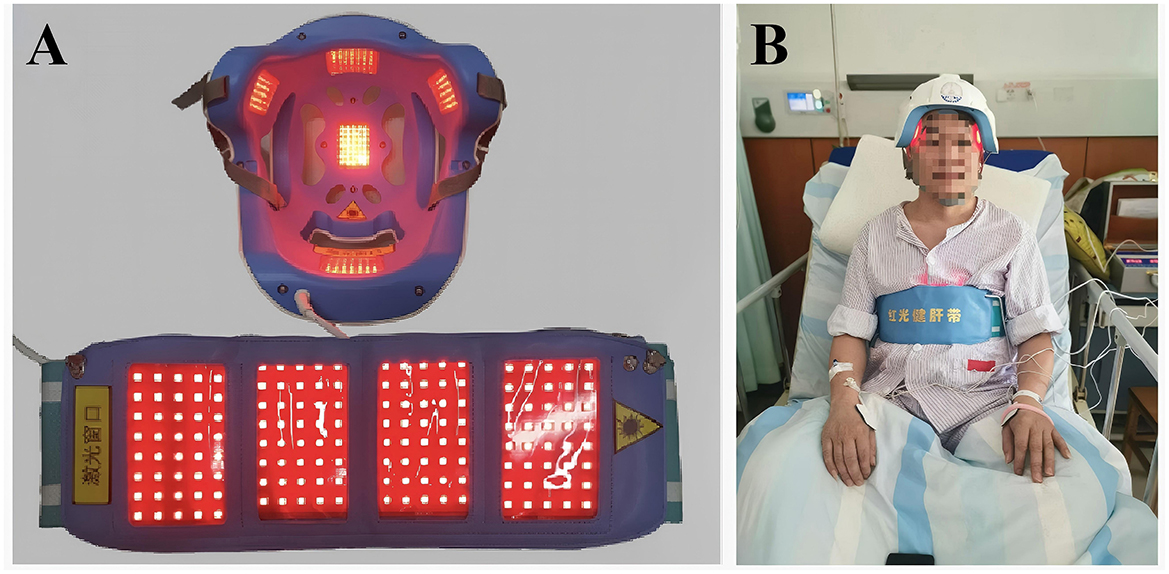 Figure 2. The therapeutic device: a 630-nm red light device used for the treatment of PSCI patients. (A) Photographs of the activated therapeutic LED light source employed in the management of PCSI patients. (B) Images of patients undergoing treatment while wearing red-light device.