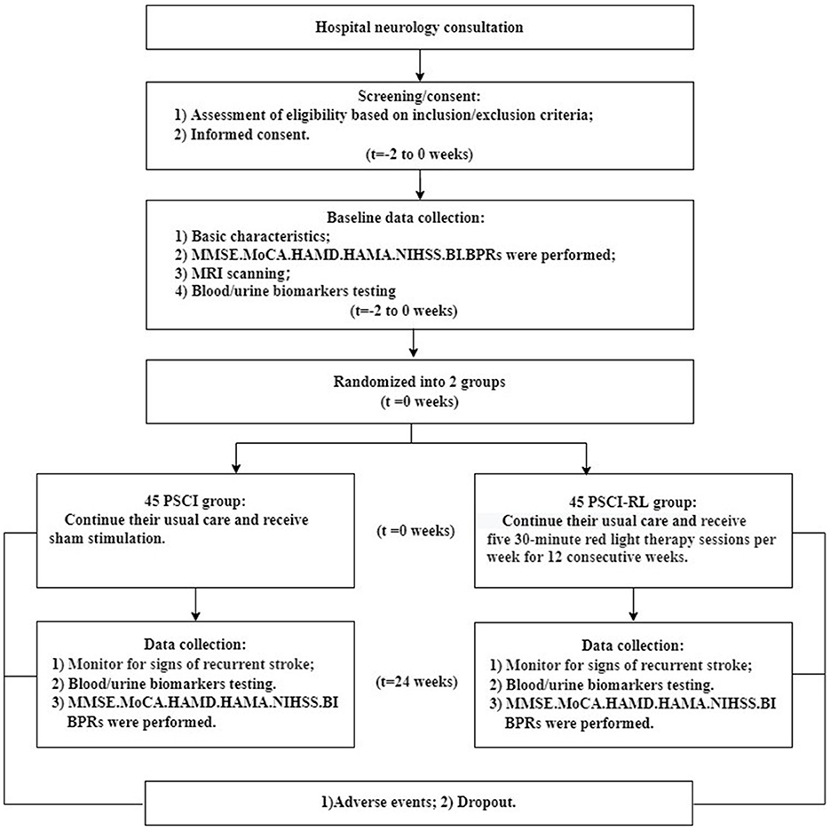 The primary objective was to test the safety and effects of RL therapy on cognitive function, neuropsychiatric symptoms, and activities of daily living in patients with PSCI. The secondary objective was to: examine changes in the concentration or activity of blood biomarkers such as FA, FDH, SSAO, Cyt-c, and CoQ10. The patients were monitored from the time of enrollment until completion of the study for any adverse events defined in the Common Terms Criteria for Adverse Events (CTCAE) version 5.0. Reports of adverse events that might be related to the intervention were also available after the study. The safety of the new wearable brain rehabilitation device was assessed based on the incidence and severity of adverse events such as headache, dizziness, or nausea. Adverse events were reported immediately and managed by experienced physicians. Details of these possible adverse events and the treatment they received were recorded by completing a case report form. Physical examination and necessary laboratory tests such as routine blood tests, liver function, renal function, lipids, glycated hemoglobin, and thyroid function tests. were completed at the beginning of the study and the end of the study.