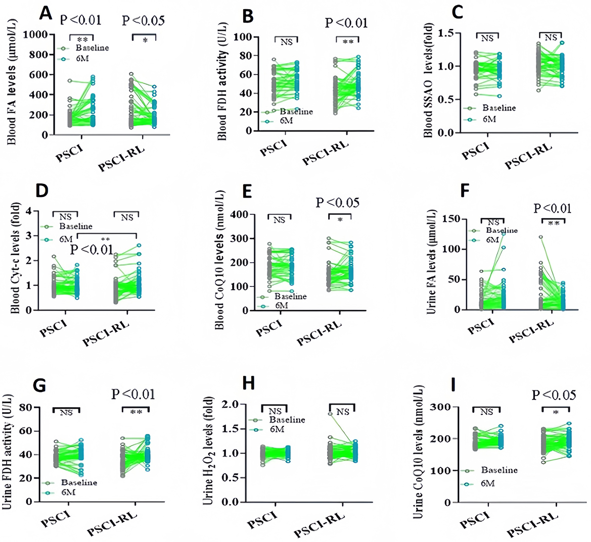 Urinary biomarkers demonstrated a pattern consistent with blood measurements. At 6 months, urinary FA concentrations were significantly lower, and FDH activity was significantly higher in the PSCI-RL group compared with the PSCI group (Figures 5F, G). In addition, urinary H2O2 levels were reduced, while CoQ10 levels were elevated in the PSCI-RL group (Figures 5H, I). These findings further support the conclusion that RL therapy enhances systemic FA metabolism in PSCI patients.