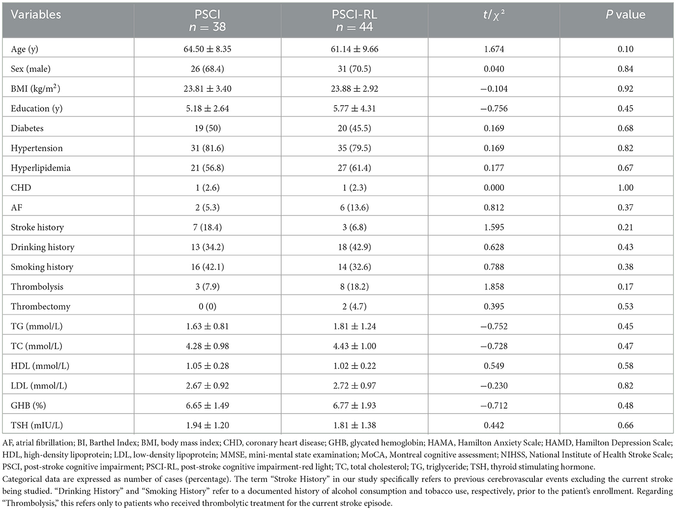 The flow of study participants is shown in Figures 3, 4. A total of 90 patients were enrolled, with both groups receiving standard treatment for cerebrovascular diseases. Eligible patients were randomly assigned in a 1:1 ratio to either the PSCI-RL group (red light therapy) or the PSCI group (sham red light therapy). The randomization sequence was generated using a random number table, without stratification. Allocation was carried out by a designated investigator who was aware of the treatment assignments. To minimize bias, this study employed a single-blind design: patients and outcome assessors were blinded to the treatment allocation, while the interventionists were not blinded due to the practical constraints of administering the therapy. During the trial, one patient in the PSCI-RL group and seven patients in the PSCI group withdrew. Ultimately, 44 patients in the PSCI-RL group and 38 patients in the PSCI group completed the intervention and follow-up.