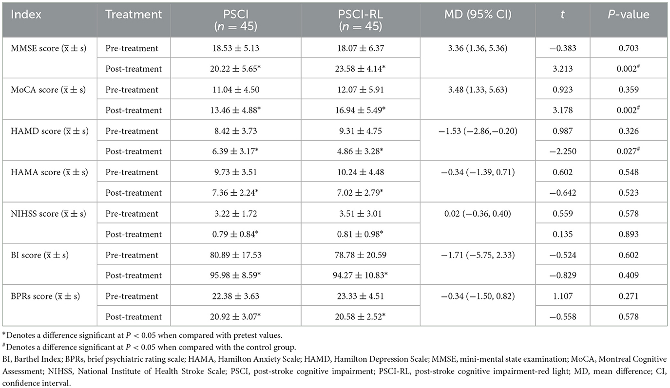 Pre-treatment scale scores did not differ significantly between groups (all P > 0.05), confirming baseline comparability. In the intention-to-treat (ITT) analysis, after 3 months of intervention both groups demonstrated significant within-group improvements in MMSE, MoCA, and BI scores, as well as significant reductions in HAMD, HAMA, NIHSS, and BPRS scores (all P < 0.05). Between-group comparisons demonstrated that the PSCI-RL group exhibited greater cognitive improvement than the control group, as reflected by higher post-treatment MMSE and MoCA scores. Specifically, the mean difference (MD) in MMSE was 3.36 (95% CI: 1.36–5.36), and the MD in MoCA was 3.48 (95% CI: 1.33–5.63), both favoring PSCI-RL. In addition, depressive symptoms improved more in the PSCI-RL group, with a HAMD mean difference of −1.53 (95% CI: −2.86 to −0.20). No statistically significant between-group differences were observed for HAMA, NIHSS, BI, or BPRS, with all 95% confidence intervals crossing zero, suggesting that improvement in these measures was similar between groups (Table 2). The per-protocol (PP) analysis produced a highly similar pattern of results, with consistent directions and levels of statistical significance, thereby supporting the robustness of the ITT findings (Supplementary Table S1).