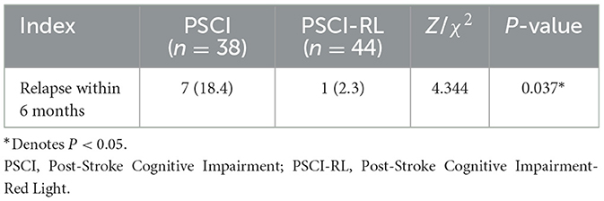 In addition, we observed the relapse of stroke in both groups during the study period. The results of statistics showed that the relapse rate in the PSCI group (18.4%) was markedly higher than that in the PSCI-RL group (2.3%; P = 0.037; Table 3).