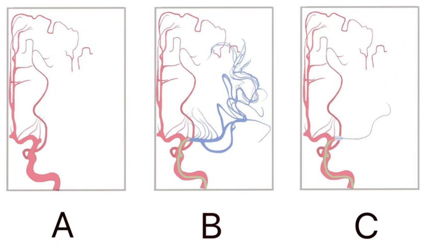 Figure 1. Schematic diagram of postadaptive treatment. (A) Occlusion of the M1 segment of the middle cerebral artery. In the red area, the anterior cerebral artery, the posterior cerebral artery, the proximal lenticulostriate artery, and the leptomeningeal anastomosis. Collateral blood flow was not involved. (B) Blue area, middle cerebral artery was fully open. (C) IPC, with the balloon placed at the occlusion site for temporary occlusion. Blue area: flow pattern was comparable to that before the surgery.