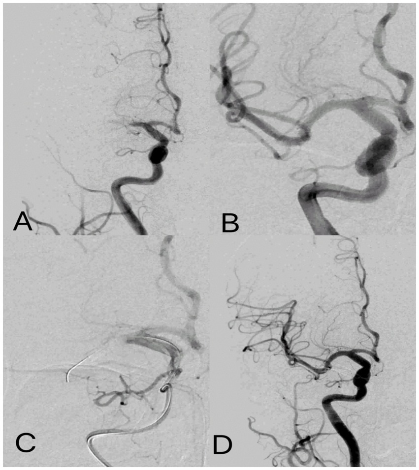 The procedure was more complex for patients with internal carotid artery occlusion. Intermediate catheters, or microcatheters passed the primary lesion of internal carotid artery, and then reached the distal segment of the middle cerebral artery to achieve middle cerebral artery recanalization. Subsequently, IPC was performed. Carotid artery recanalization finished after IPC. All tandem lesion-related interventional techniques were done according to the specific situations (see Figure 2).