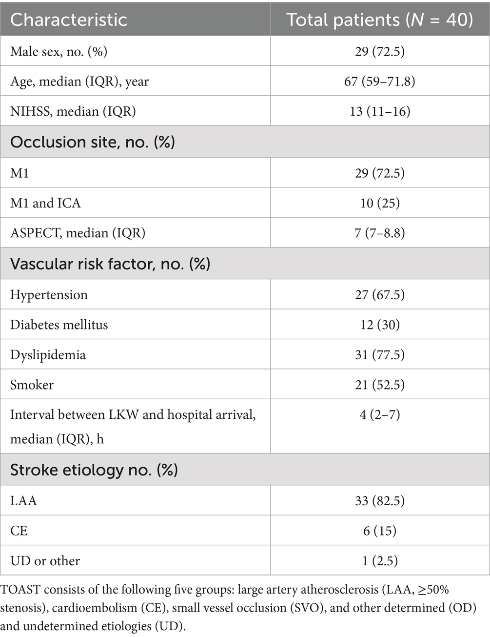 From January 1,2022 to June 30,2023, a total of 45 patients were recruited across our stroke center (Supplementary Figure 2) from IPC-TRACK cohort 0.5 patients had difficulty in complying with ischemic post-conditioning and the final cohort comprised 40 patients underwent IPC. Their baseline characteristics are summarized in Table 1. The median age was 67 years (IQR, 59–71.8), and 29 patients (72.5%) were male. The median NIHSS score on admission was 13 (IQR, 11–16), and the median ASPECTS was 7 (IQR, 7–8). The most common occlusion site was the M1 segment of the MCA (30 patients, 75%), followed by tandem M1 and ICA occlusion (10 patients, 25%).