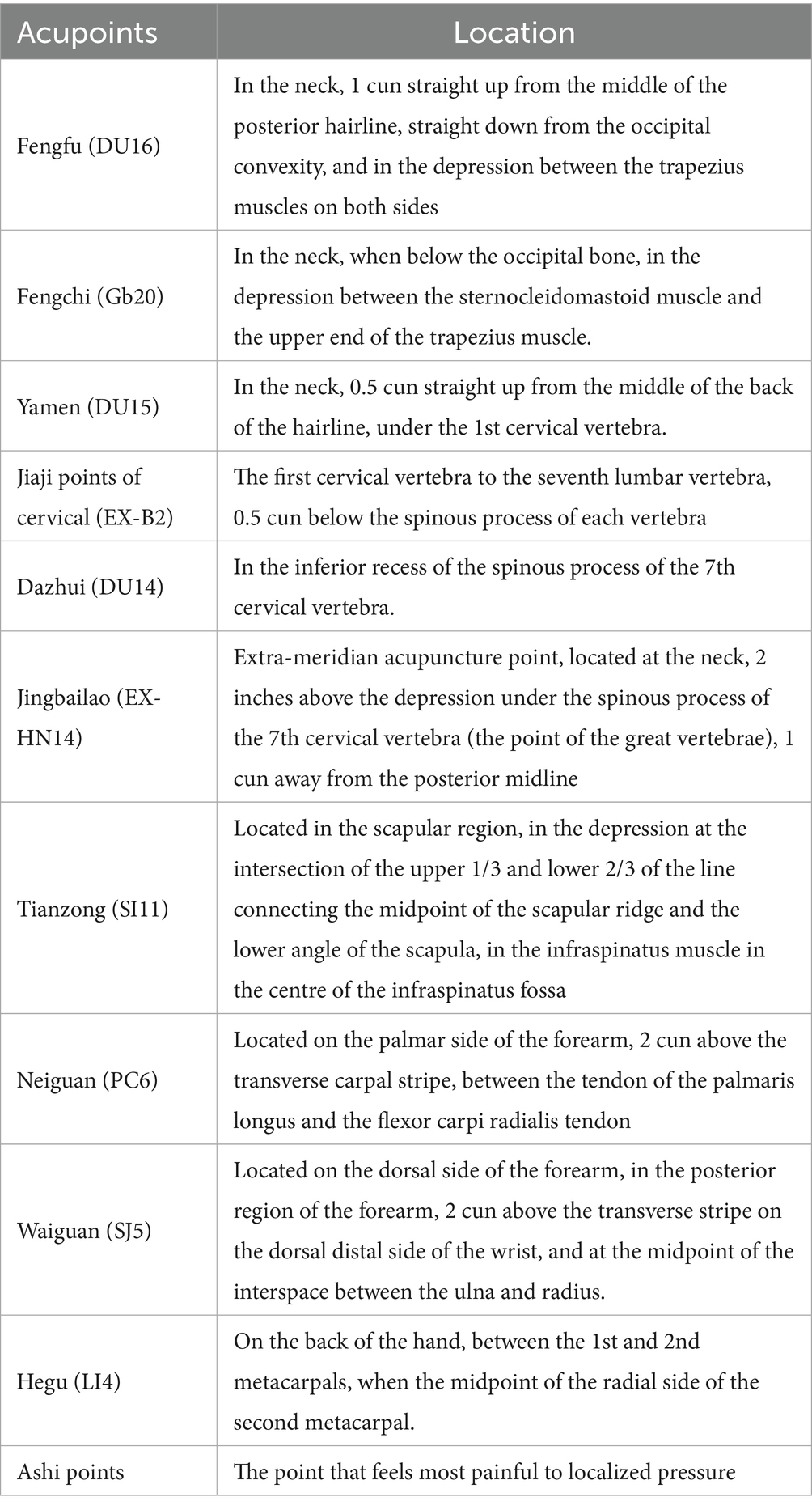 1. Muscle relaxation: the participant will assume the prone position or sitting position; the practitioner will relaxe the muscles with traditional Tui Na techniques; and the doctor will relaxe the muscles of the neck, shoulder, and upper back with kneading, plucking, and pinching. This method focuses on pressing and kneading at the strips or hard knots with points, plucking, and generally finds pressure points or hard knots in the trapezius, sternocleidomastoid and transverse cervical vertebrae, and kneading and kneading techniques are performed for approximately 10–15 min. Once the muscles are relaxed, the following points will be massaged and stimulated with the thumb or elbow joint: Fengfu (DU16), Fengchi (Gb20), Yamen (DU15), Jiaji points of cervical (EX-B2), Dazhui (DU14), Jingbailao (EX-HN14), Tianzong (SI11), Neiguan (PC6), Waiguan (SJ5), Hegu (LI4), Ashi point. Table 1 shows the location of the acupuncture points.