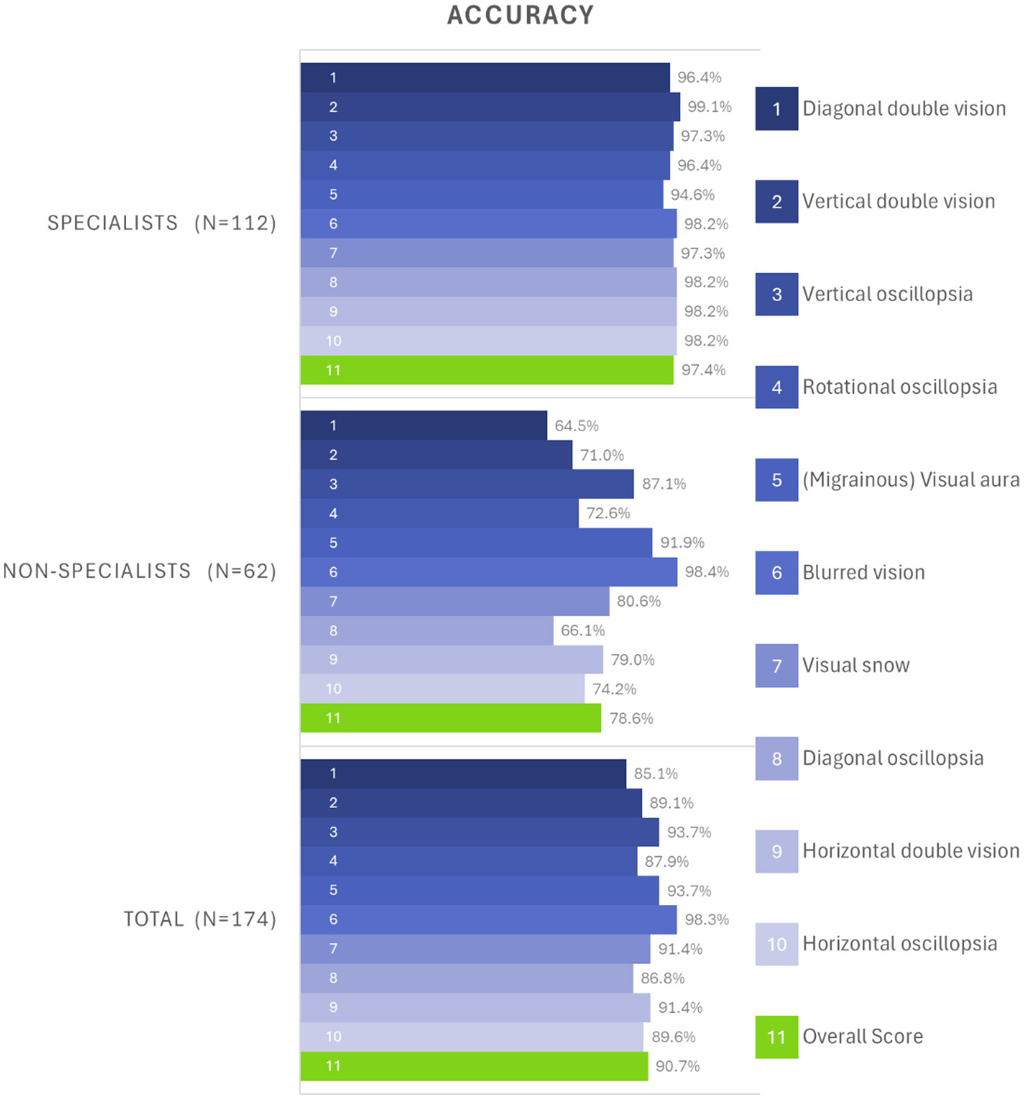 Figure 2. Bar chart of overall accuracy rates per pictogram, divided by specialists (top), non-specialists (center), and grouped from all participants (bottom). The 10 different test items are depicted in shades of blue, and the overall average score is depicted in green. For example, test item 3 (“vertical oscillopsia”) was correctly identified by 97.3% of specialists (third row of top chart), and by 87.1% of non-specialists (third row of center chart). Note that the non-specialists were given a simple English description of the symptom (“Your surroundings appear to be moving up and down” instead of “vertical oscillopsia”). While some pictograms were easily understandable by non-specialists (e.g., “(Migrainous) Visual aura” and “Blurred vision”), others were difficult to tell apart (e.g., “Diagonal oscillopsia” and “Diagonal double vision”) for the non-specialists.