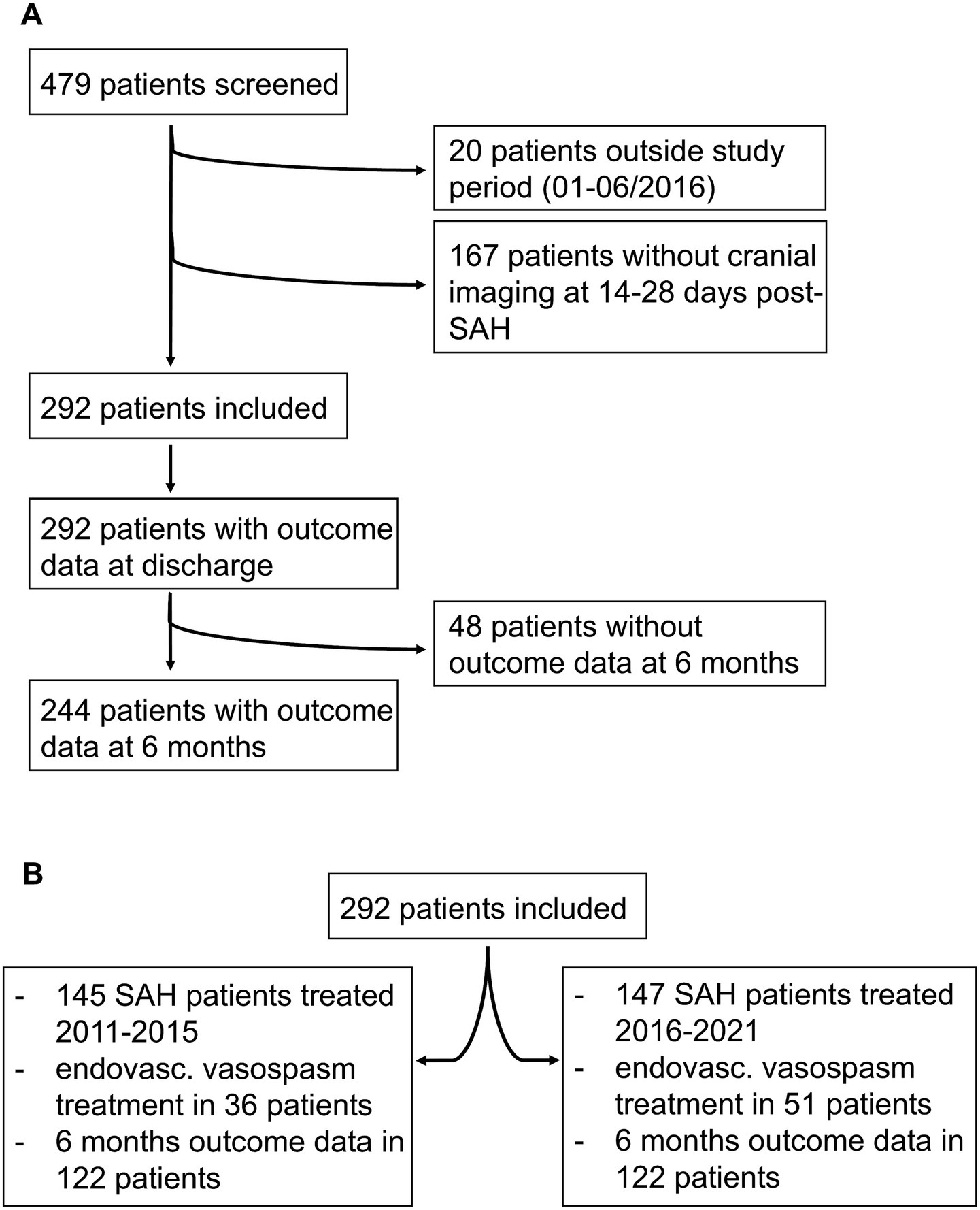 A total of 479 consecutive patients treated at our department between January 01, 2011, and June 30, 2021, with the diagnosis of spontaneous SAH were screened. Of them, 20 were treated between January 01, 2016, and June 30, 2016 and were thus excluded. Of the remaining 459 patients, clinical outcome data and cranial CT or MRI acquired 14–28 days after SAH onset were available for 292 patients, who were included in our study. Of the 292 patients, 145 were treated before the introduction of ciaN (2011–2015), and 147 were treated after the introduction of ciaN (2016–2021). Figure 1 presents a detailed overview of the included patients.